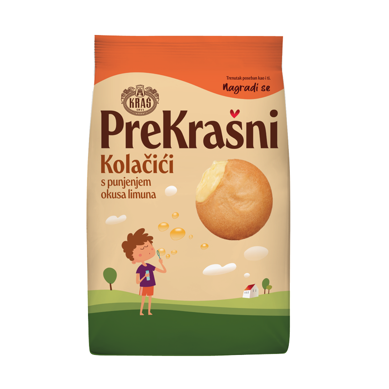 Neka tvoj trenutak bude jedinstven kao i ti; kao i znanje kojim su stvarani najfiniji Kraševi kolačići s kremastim punjenjem okusa limuna. Gricni komadić biskvita s dodatkom limunove korice i u srcu kolačića pronađi užitak i slatku pozitivu jer... Kakav kolačić, takav trenutak. PreKrašan.